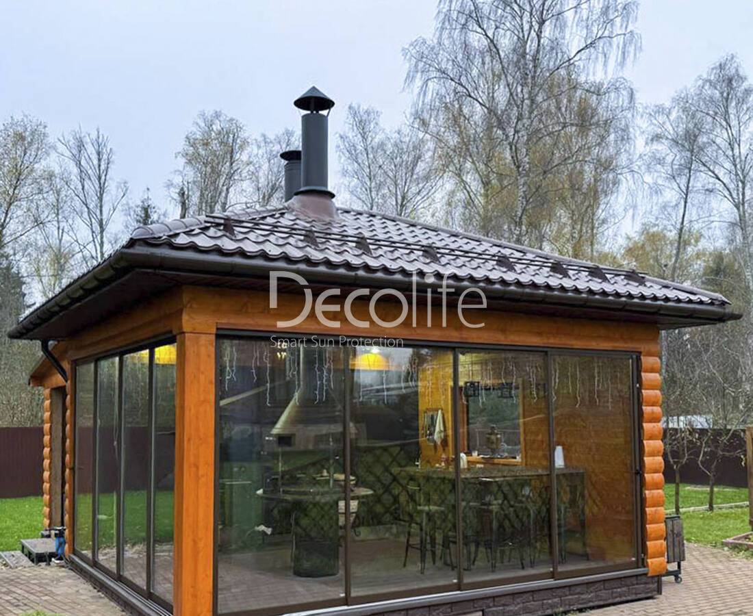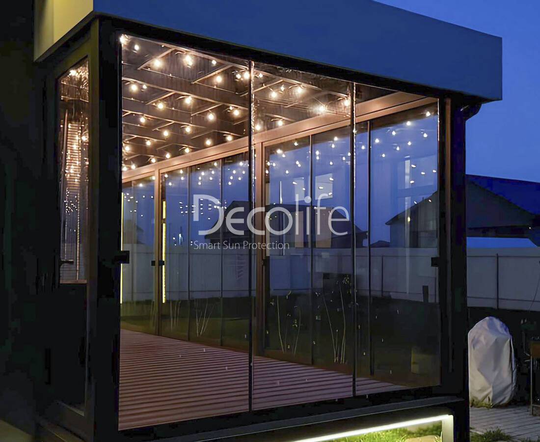 Все это делает конструкции не только удобными в использовании, но и весьма долговечными. Стильная эстетика дает возможность оформить любое пространство, все виды пергол Decolife с помощью оригинального остекления. Возможна установка до 12 створок, рекомендуется монтировать панели высотой в 3 м.