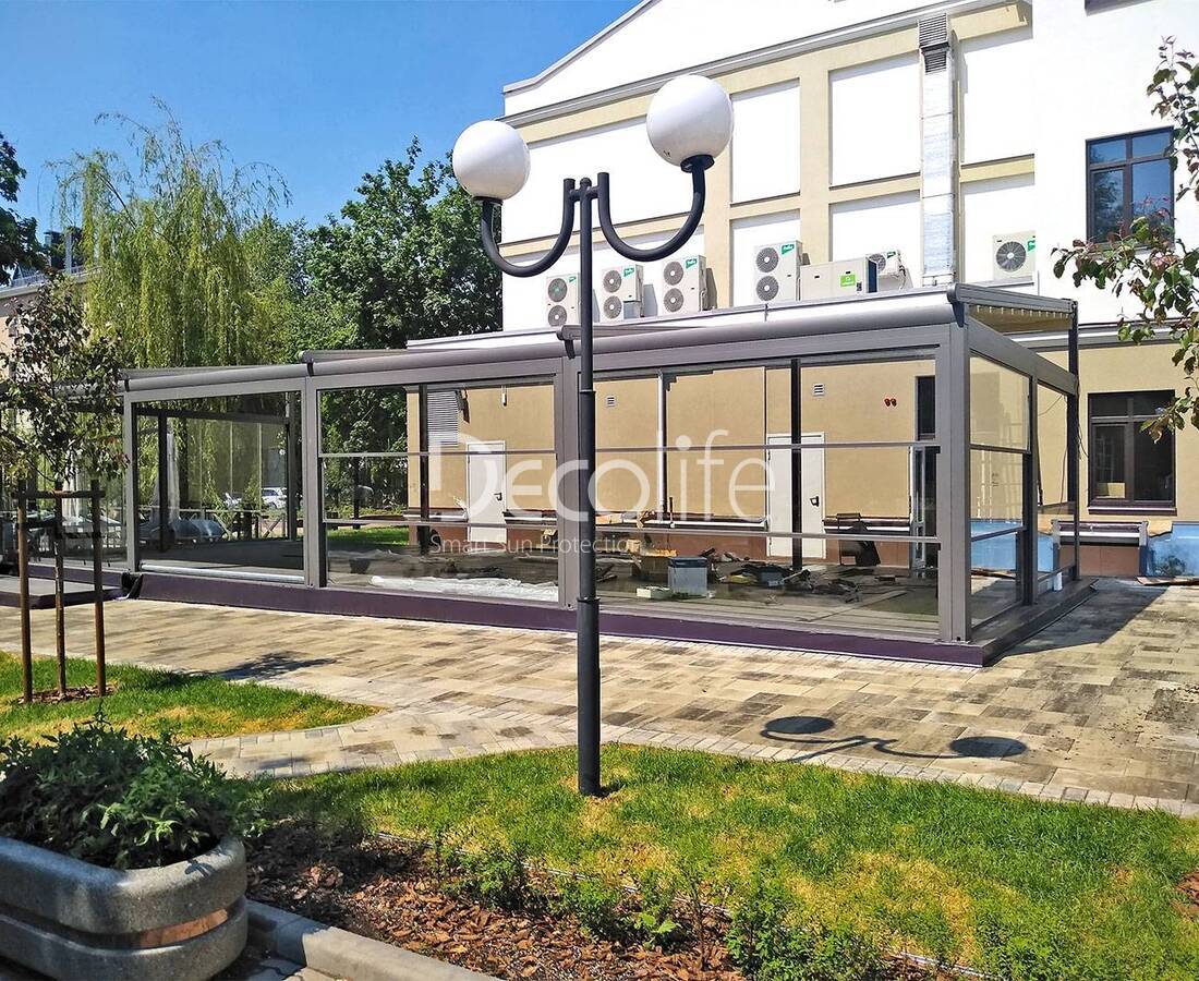 Пергола Decolife Basic&Pro New с безрамным S100 и гильотинным W500 остеклением - г. Белгород, Кафе Орион