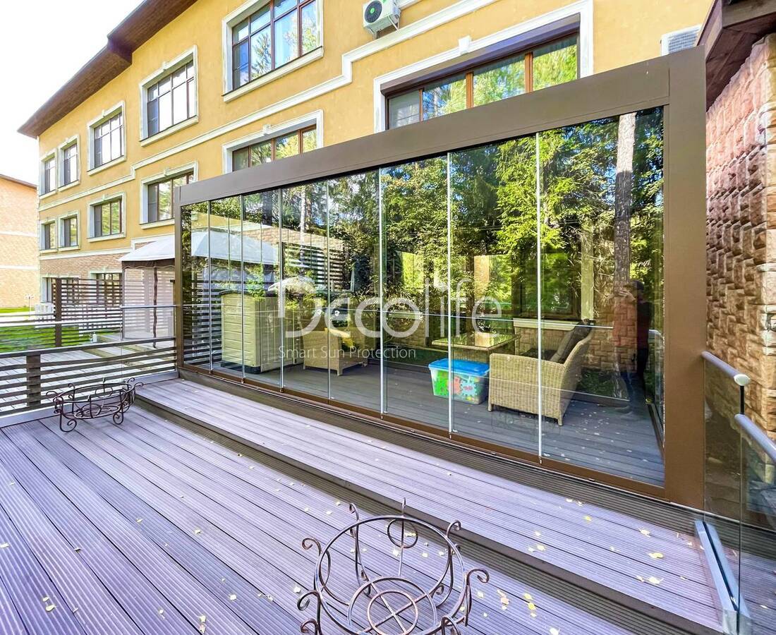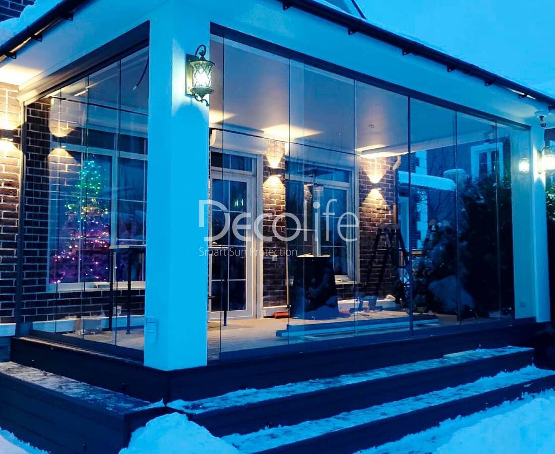 Пергола тентовая Decolife Basic&Pro New + Гильотинное остекление W500 + вертикальная система ZIP 100 - реализовано партнером "ООО Люкс Террас" - Московская обл.